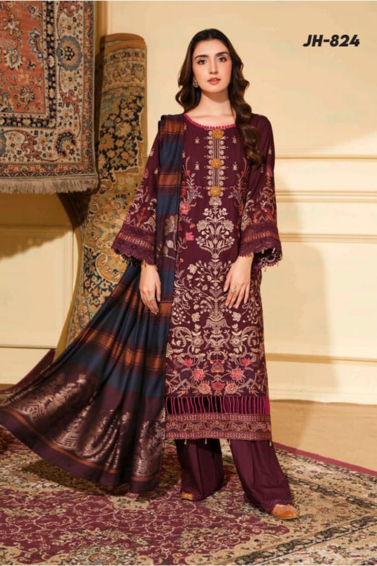 Introducing this exquisite 3-piece winter collection ensemble, designed for a sophisticated and luxurious look during the cold season. The rich maroon/plum shirt features a stunning combination of intricate heavy embroidery and elaborate jacquard/woven patterns across the front, hem, and sleeves. Crafted from a comfortable winter fabric, it's complemented by a beautifully patterned shawl and matching trousers for a complete and opulent attire.